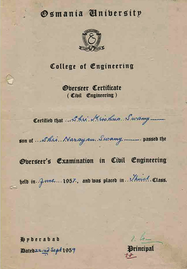 O.U.COLLEGE OF CIVIL ENGINEERING CERTIFICATE 1957 |