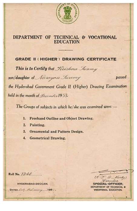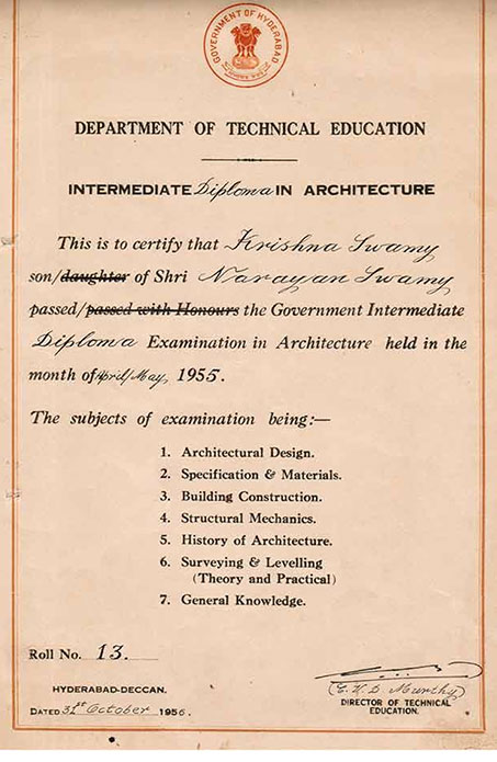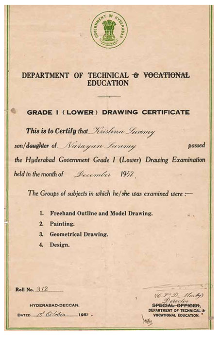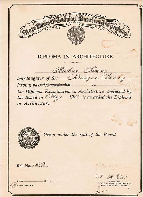 As a Private Student he appeared for the NATIONAL LANGUAGE ‘HINDI PRATHAMA’ Examination and was awarded the Certificate in NOVEMBER 1952. *One of his Close Friend Sri. Vishnu Dutt Bharathi whom he cannot forget in his life inspired him to join the College of Architecture in 1952, because he was good at drawing and Art Work Passed the 3 Years DIPLOMA EXAMINIATION IN ARCHITECTURE IN 1955 as well passed the Lower &Higher Grade Government Drawing Examination. |
