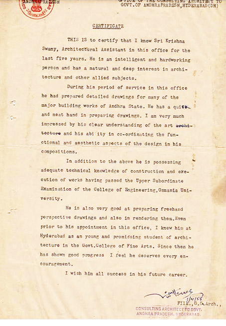 who was the Visiting Professor in the Architecture College. Next day at 8-30 A.M. he went to Wish Mr. ISSIC but he miss took my Father’s Visit and a great surprising turning event taken Place, and he readily offered Architectural Designing Post to My Father, that is a un-imaginable Turning point in the life of our Father, he Resigned the Post in M.C.H. and Served at Kurnool 2 ½ Years. In the Re-Organization between Telangana & Andhra. All the Offices Shifted to Hyderabad Capital City, some time Earlier our Father sent his Bio-Data to C.P.W.D., New Delhi, and he got the letter to appear before the Selection Committee for the Appointment of Architectural Assistant Post for the Construction of VIGNAN BHAVAN. He stood 1st in Test, then interviewed, Finally he was selected, then he Resigned P.W.D., at Hyderabad and Joined the Service C.P.W.D., at New Delhi.