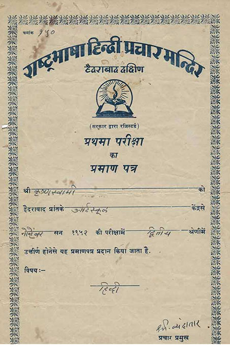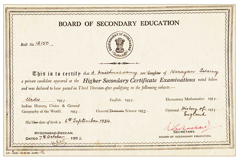 Completed his Matriculation Examination in division from City College. Hyderabad in the year 1952. He was interested in Sports i.e., Volley Ball, cricket, Cycle Racing etc., and joined the national Cyclists Association and received a Cycle Championship Certificate on 21st of JANUARY 1952.