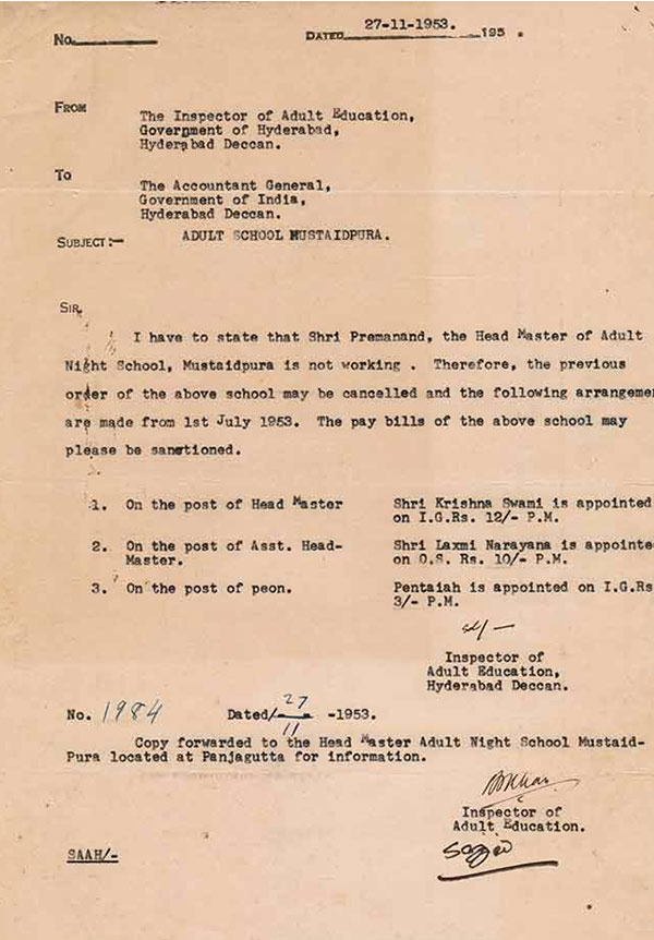 Since he was giving Tuition from the beginning the AADULT EDUCATION DEPARTMENT, Government of Hyderabad, appointed him on 22-6-1953 as a HEAD MASTER of the NETAJI RATHRI PATASHALA at Panjagutta, Hyderabad, vide Office Order No. 1653, Dt. 26-9-1953. He used to teach from 8-00 P.M to 10-00 P.M. on a Monthly Salary of O.S. Rs. 10/- per Month, i.e., about Rs. 6/- I.G. Present Currency, and started earning from Govt, Service.