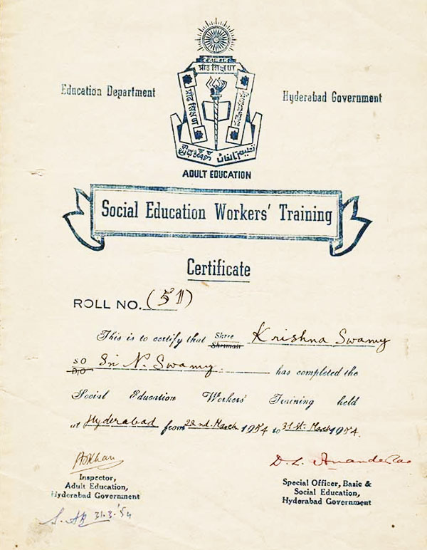 He joined the Social Education Worker’s Training course through ADULT EDUCATION DEPATMENT and Received the Social Welfare Course Certicicate on 31st MARCH 1954.