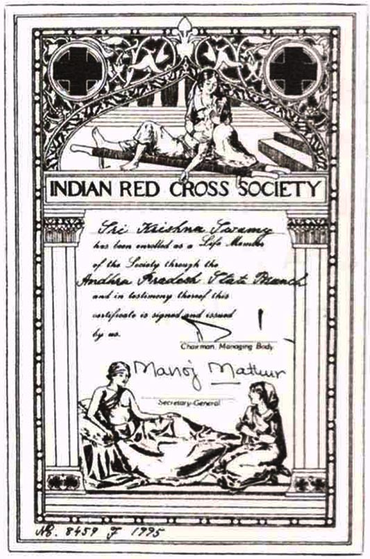 Indian Red Cross Society is a world wide organization engaged in medical care and humanitarian services rendered at the time of natural calamities effected by Earth Quakes, Floods and disastrous being interested in such activities I became the Life Member vide Life Membership No. 1833, under the Chairmanship of A.P. Governor his Excellency Shri Krishna Kanth at IRCS, Rajbhavan, Hyderabad on 6-9-1996. |