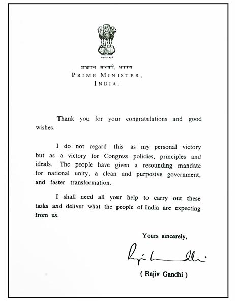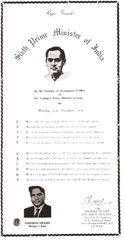 LETTER OF SRI RAJIV GANDHI PRIME, MINISTER OF INDIA. MESSAGE OF UNITY TO KRISHNA SWAMY |