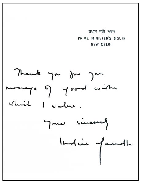 HAND WRITTEN LETTER OF MRS. INDIRA GANDHI, PRIME MINISTER OF INDIA. MESSAGE OF GOODWILL TO KRISHNA SWAMY