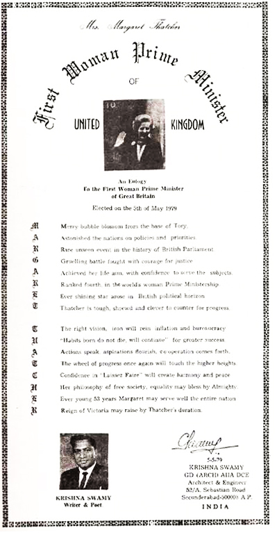 THE 1ST WOMAN PRIME MINISTER OF BRITAIN MRS. MARGARET THATCHER, POEM PRESENTED IN HER HONOUR ON 5TH OF MAY 1979. |