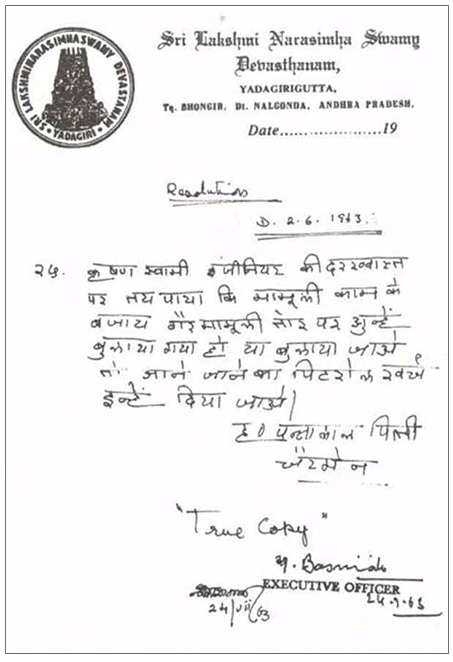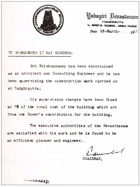 In the year 1962, I resigned my service form C.P.W.D., New Delhi, and came back to Hyderabad, there was Consulting Architect and Engineers Post at Yadagiri Narasimha Swamy’s Temple, Sri Pannalal Pittie was the Chairman of the Temple Trust Board, after seeing my testimonials and experience in the filed of Engineering and Architecture I was appointed as Consulting Architect and Engineer for the Temple in the year 1962-63, on 7% fee over the estimated value.